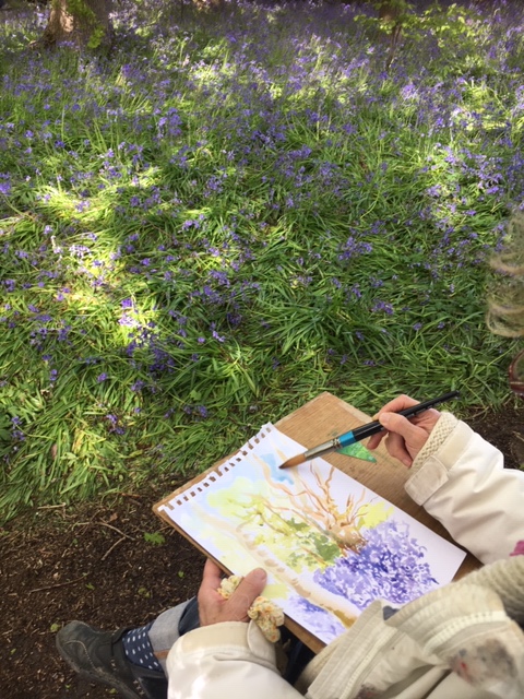 This was a one-day course painting watercolours in the bluebells at the Bluebell Farm, Arlington on 8th May, for beginners and more experienced painters. I demonstrated watercolour technique in the cosy kitchen while lunch was being prepared, then the sun came out and we were sat outdoors after a fantastic lunch cooked by Philippa Vine from Bluebell Farmhouse Kitchen.