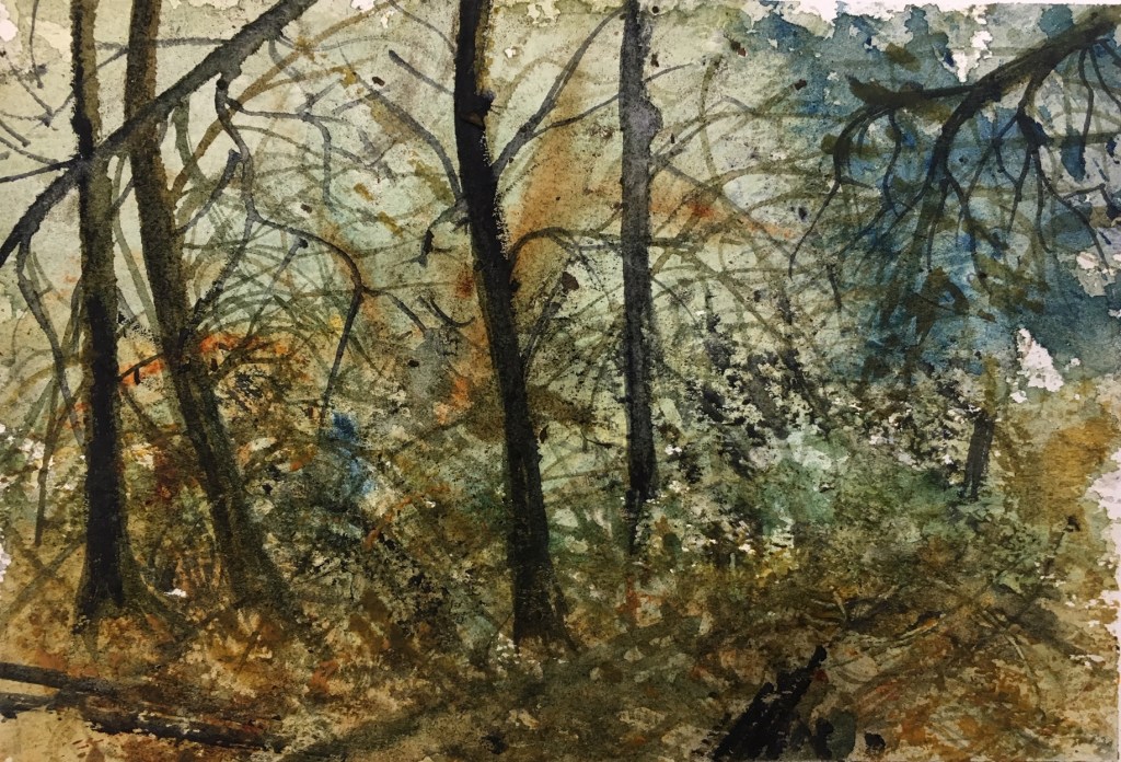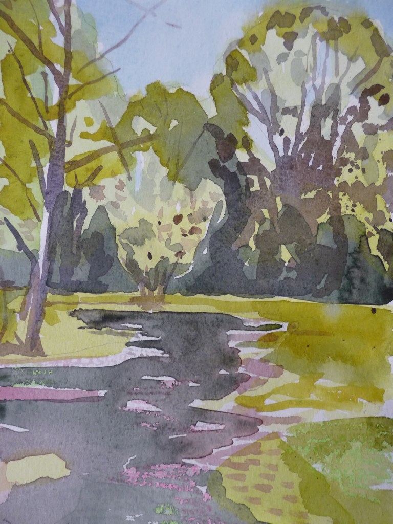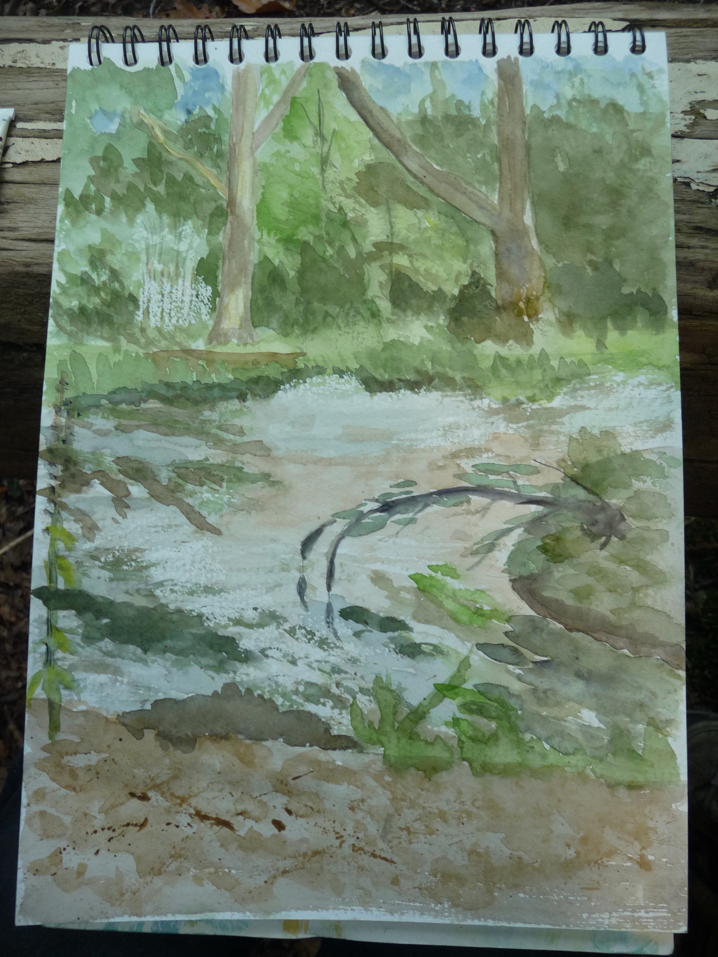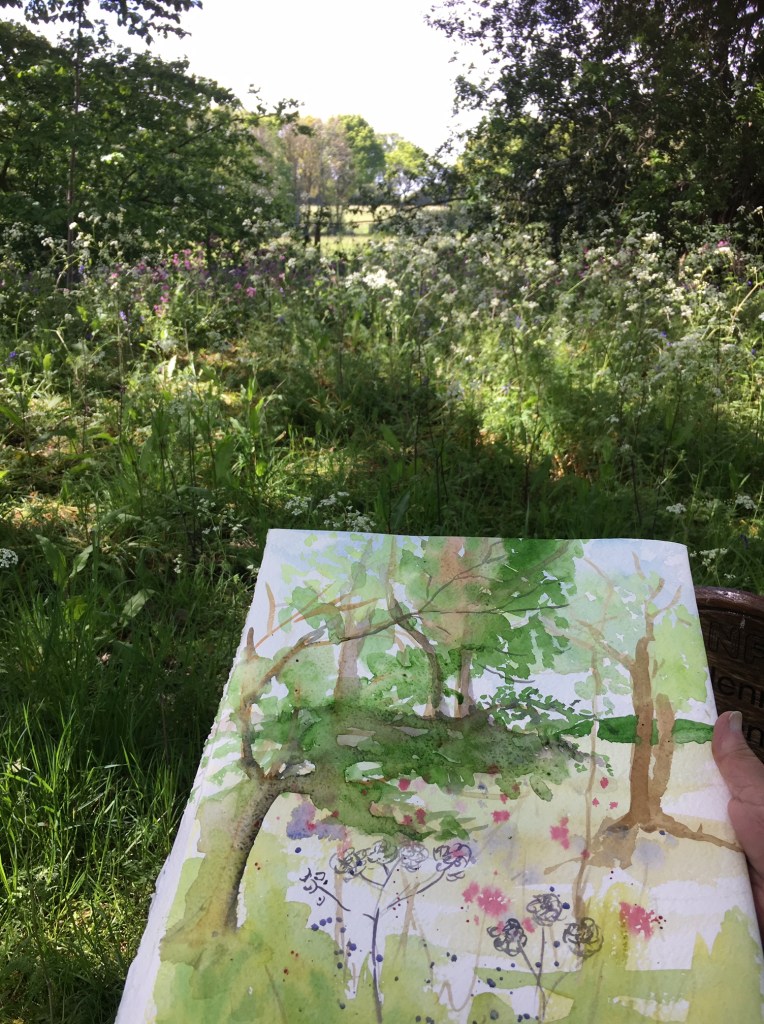 First we settled ourselves into Philippa’s cosy, spacious kitchen while she started on the lunch. As it was raining, we stayed indoors while I talked about and demonstrated my approach to watercolour. Fortunately the rain stopped, so before lunch the group explored the woods, and chose places to paint.
