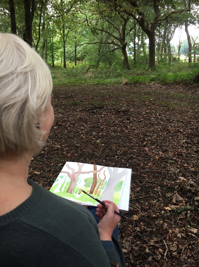 This week I held a painting class in the beautiful woods at Bates Green Farm near Arlington. In Spring this wood is full of bluebells and open to the public, but now it is peaceful and quiet, a perfect escape after the busiest part of the year. Philippa and Michael Vine farm at Bates Green, and Philippa runs a cookery school where she cooks our delicious lunch with local seasonal ingredients.